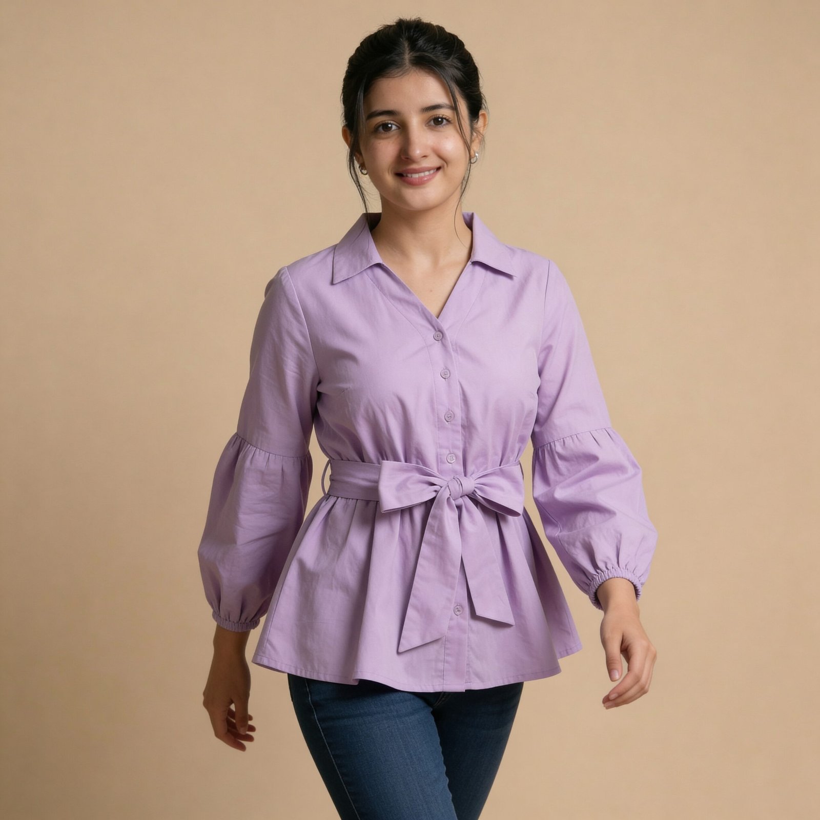 Soft lavender peplum top with elegant puff sleeves and adjustable waist tie. Flattering fit, lightweight fabric, perfect for casual outings or chic everyday wear.