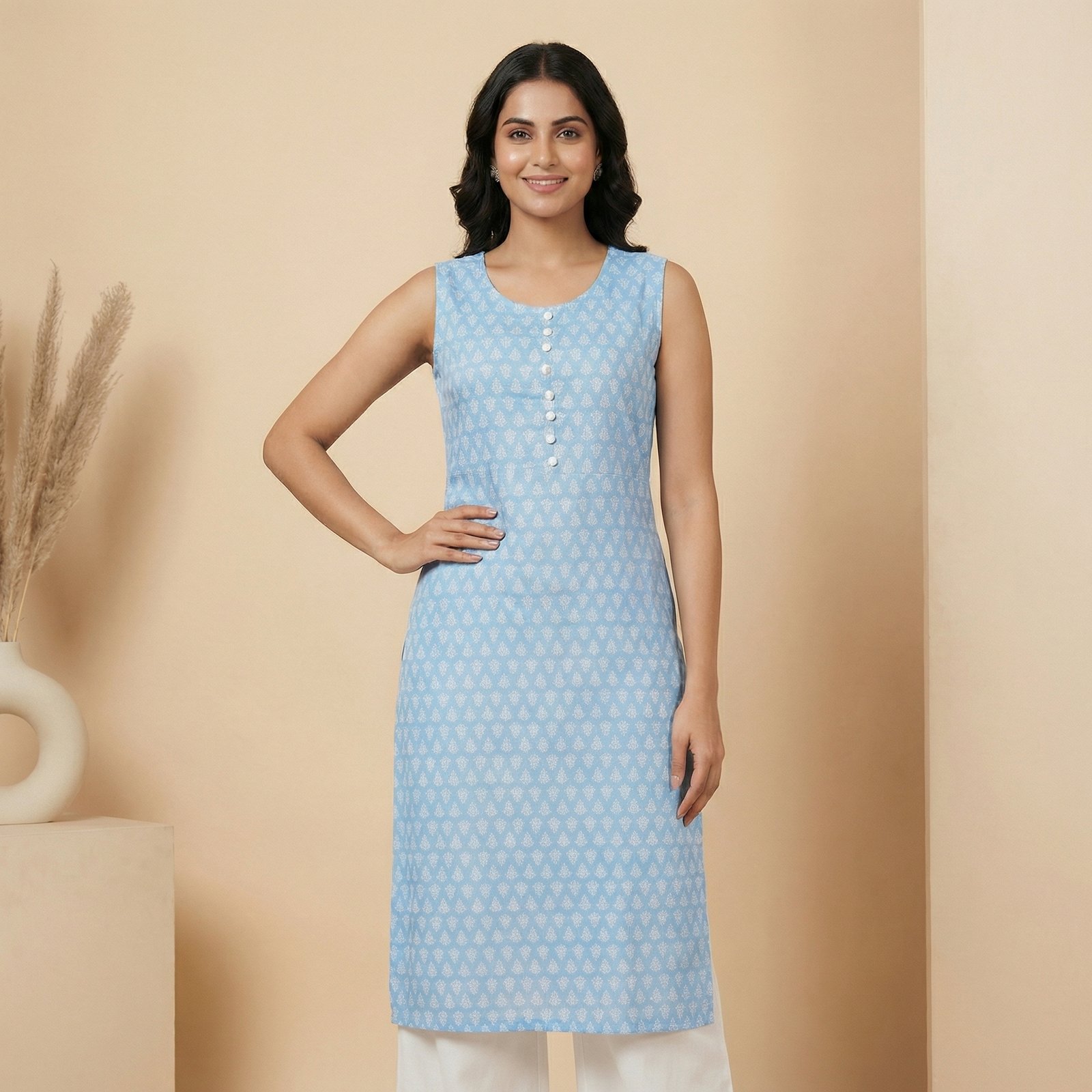 Light Blue Printed Rayon Kurti – Sleeveless Straight Fit Ethnic Wear
