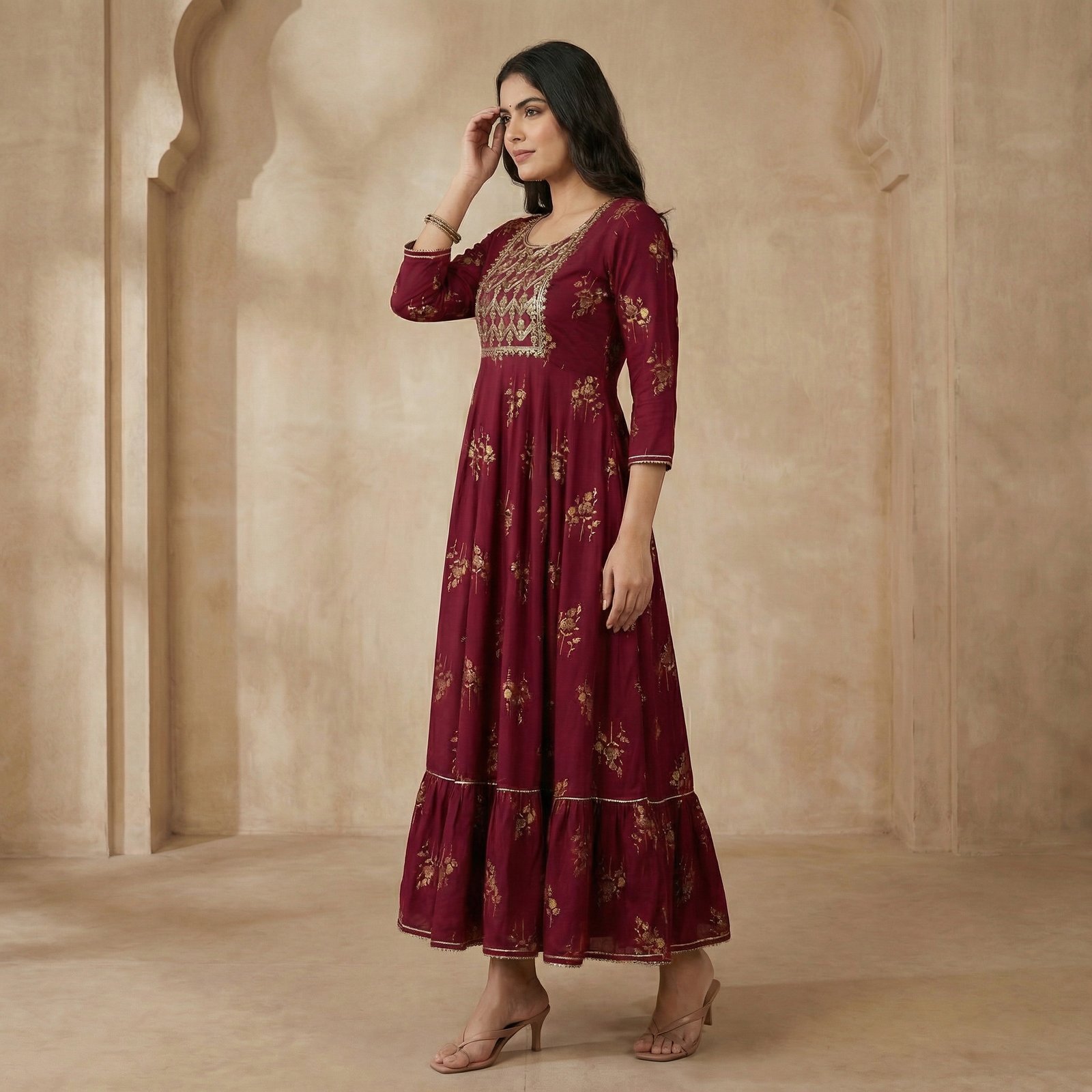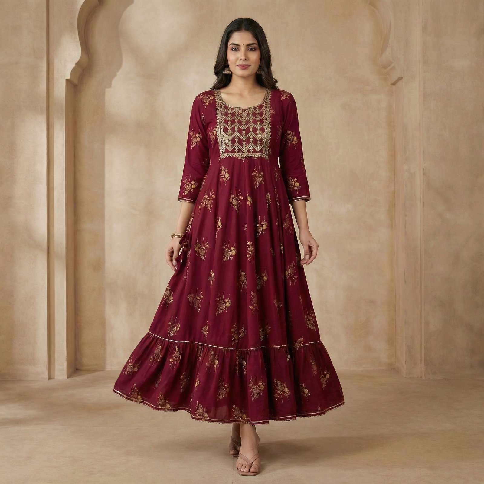Graceful maroon viscose rayon Anarkali with intricate gold embroidery, floral motifs, and a rich flared silhouette. Ideal for festive and special occasions.