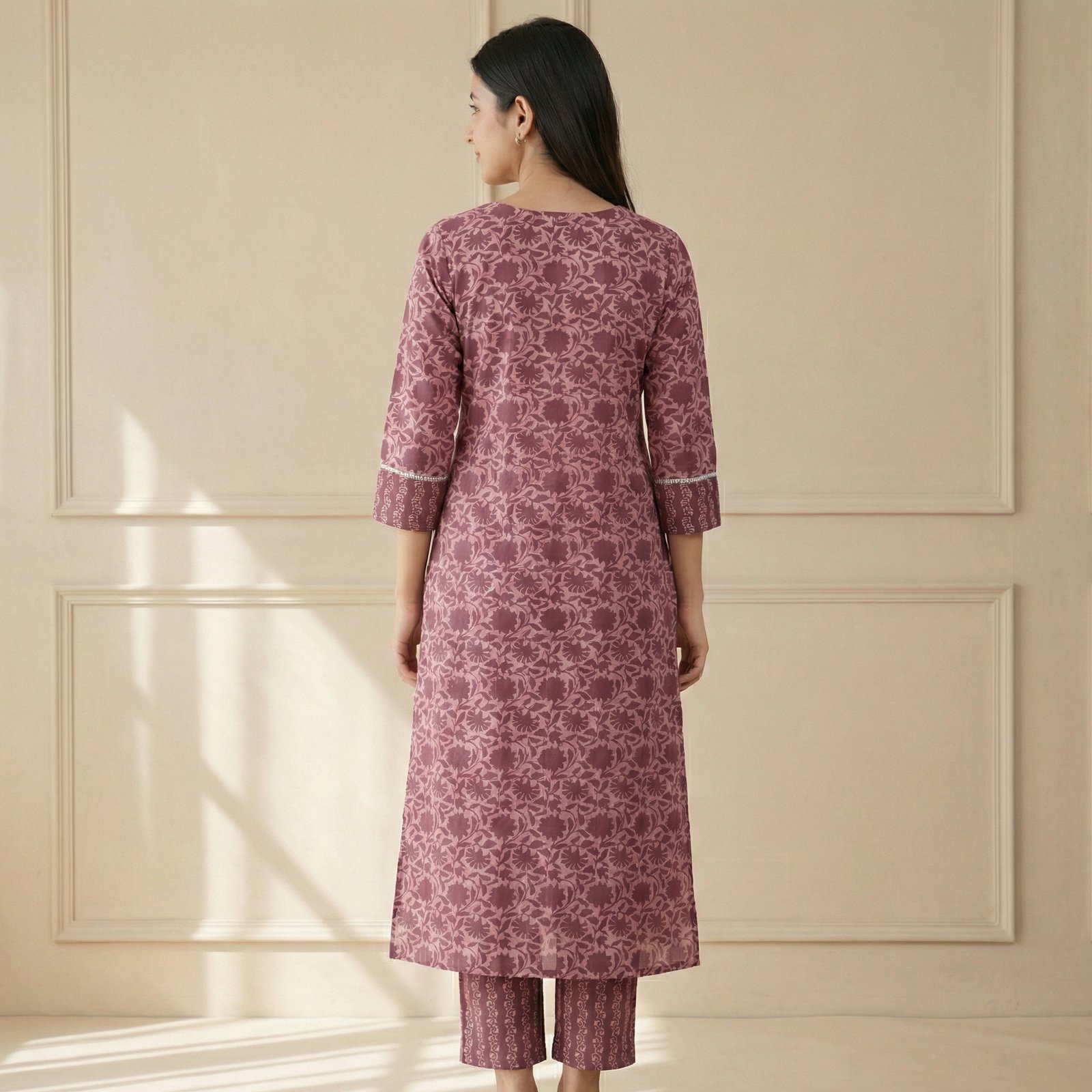 Elegant mauve floral kurta pant set with subtle embroidery and a comfortable fit. Perfect for office, casual outings, and festive occasions.