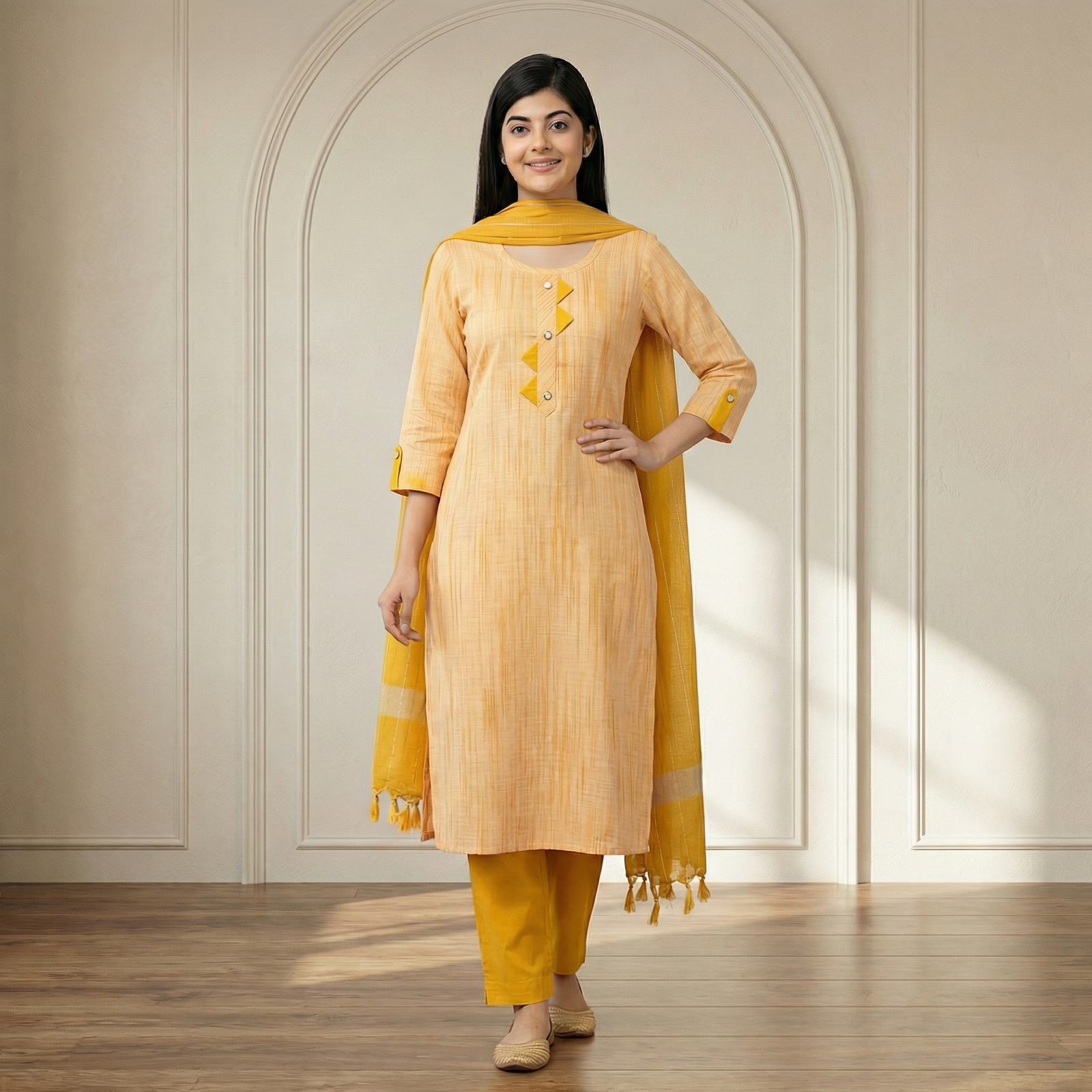 Elegant mustard yellow cotton kurta set with matching pants and dupatta. Soft, breathable fabric perfect for daily wear, office, and festive occasions.