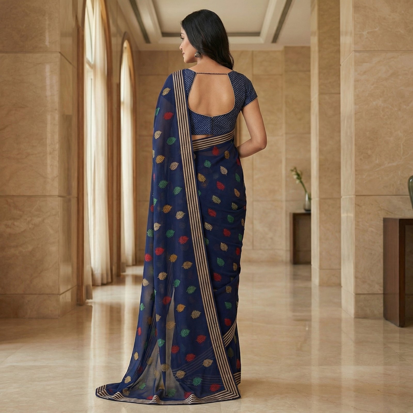 Elegant navy blue georgette saree featuring multicolor leaf motifs and a refined striped border. Lightweight, flowy drape with matching blouse—perfect for festive and party wear.