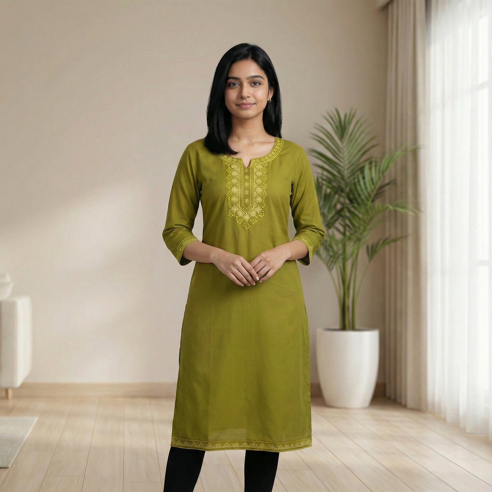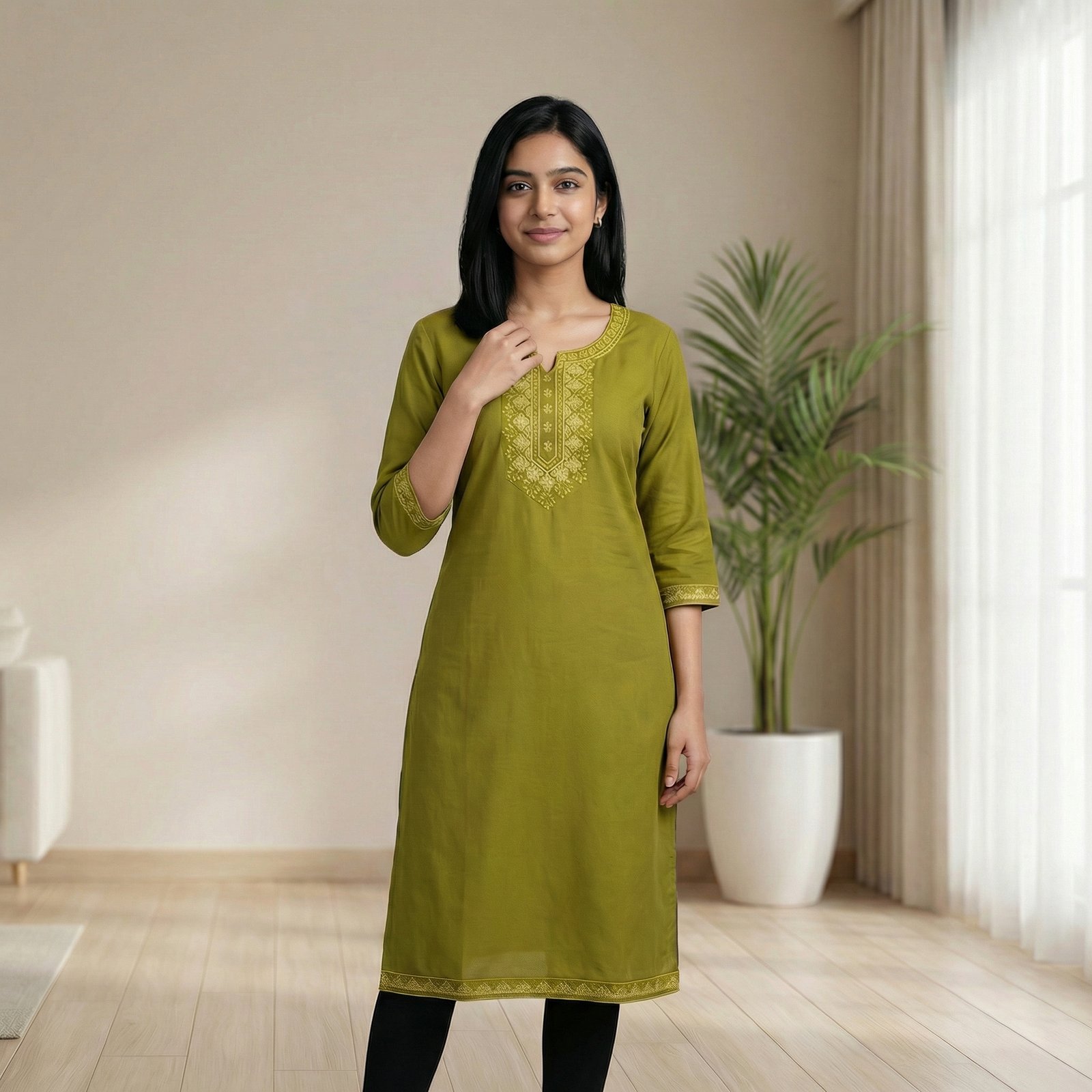 Elegant olive green straight kurti with intricate embroidered yoke, soft cotton-blend fabric, and 3/4 sleeves. Perfect for office, casual outings, and festive wear.