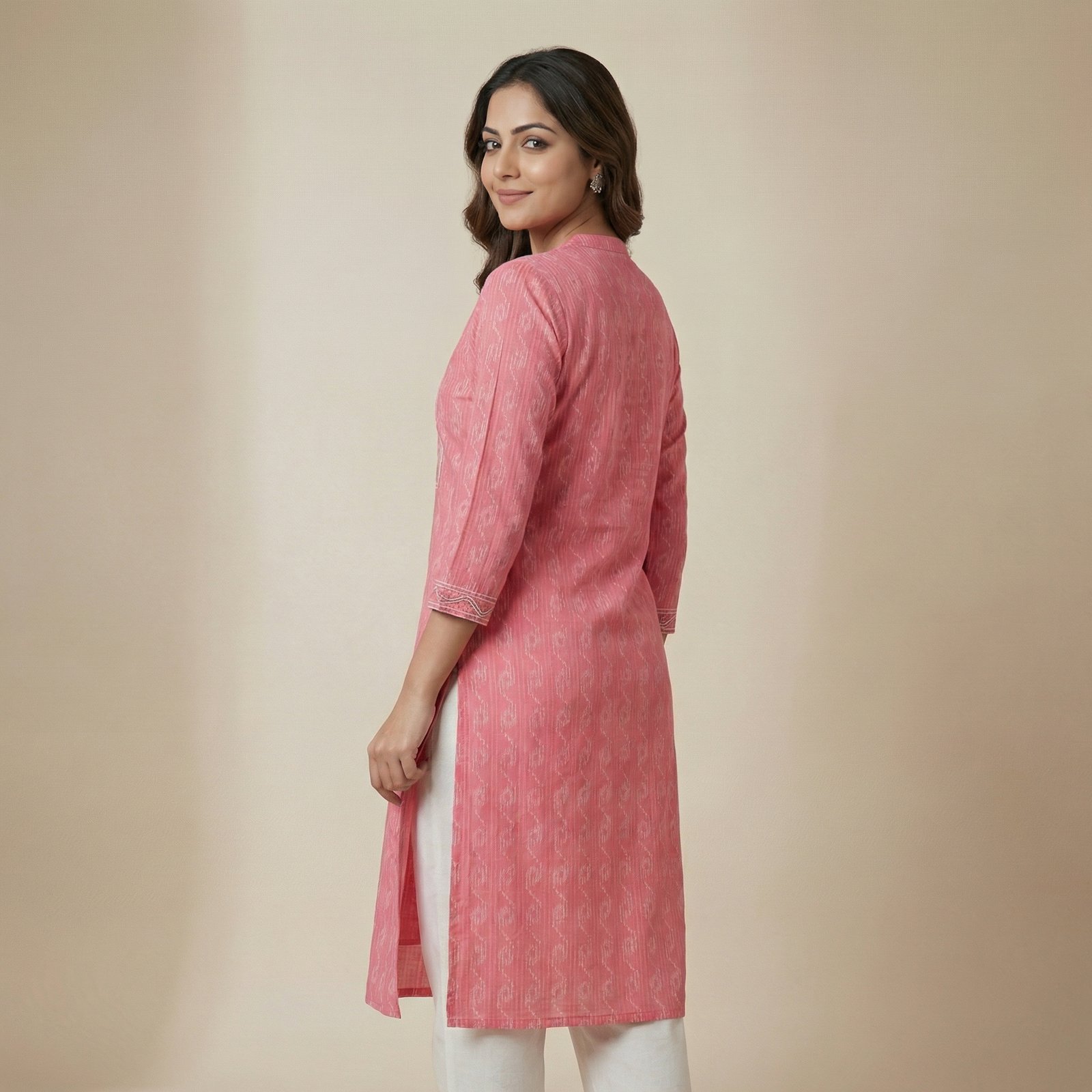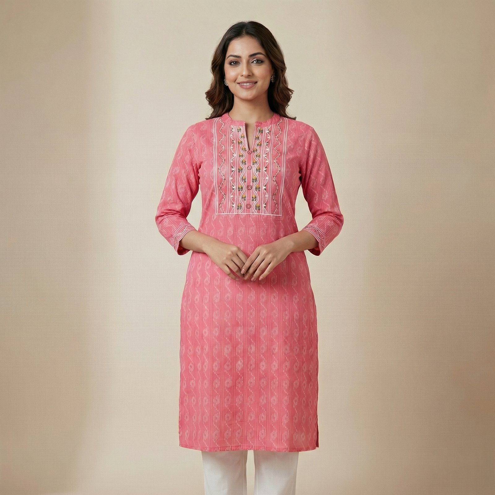 Soft cotton pink kurti with elegant front embroidery. Comfortable straight fit design, perfect for daily wear, office, and casual outings.
