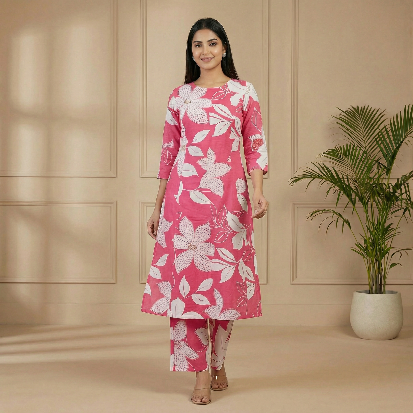 Pink Floral Cotton Kurta Pant Set – 3/4 Sleeve Printed Ethnic Wear