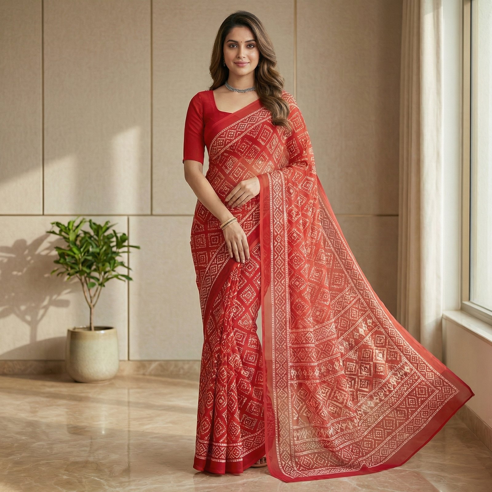 Graceful red chiffon saree with white geometric prints and a matching half-sleeve blouse. Lightweight, flowy, and perfect for festive wear and elegant occasions.