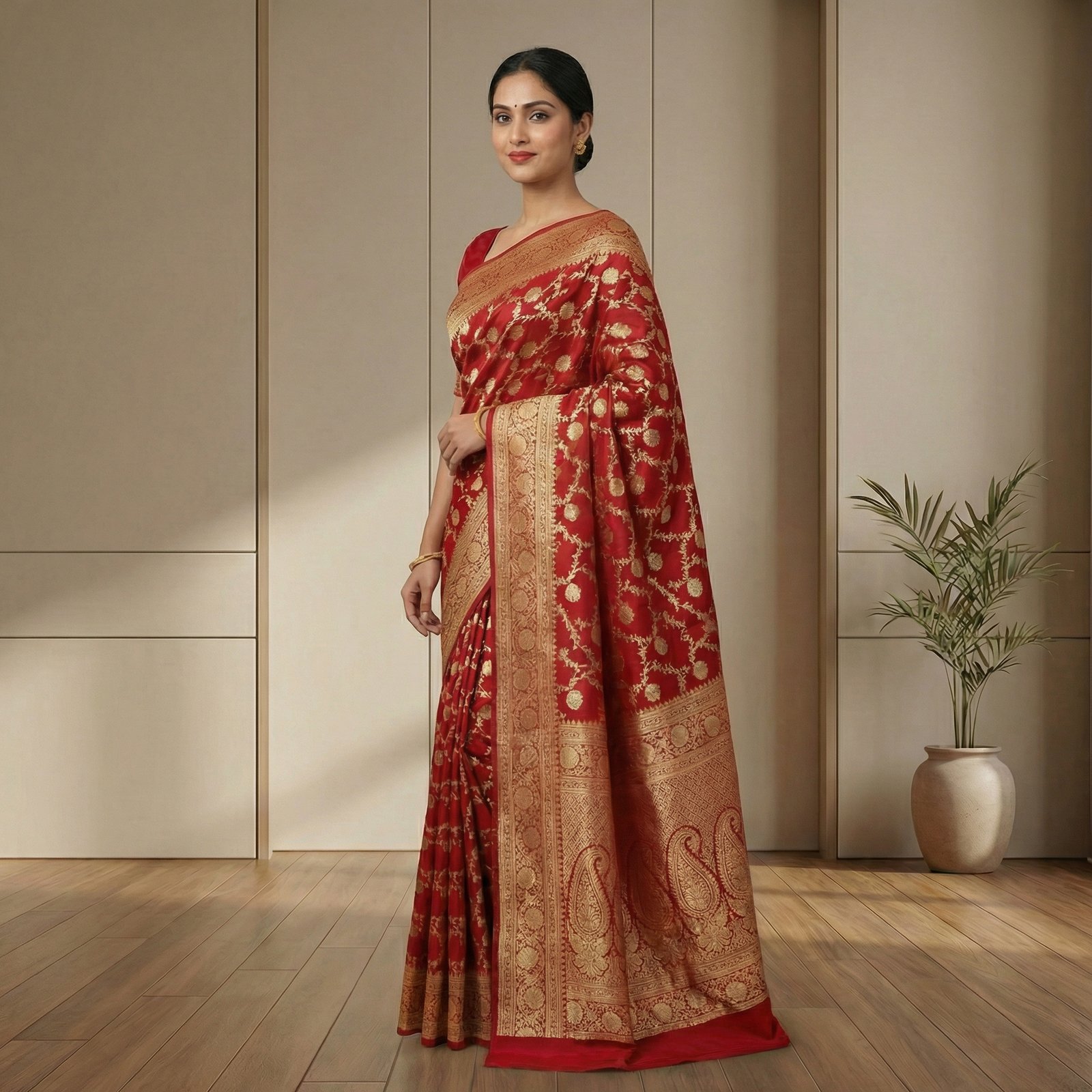 Elegant red Kanjivaram silk saree featuring dense gold zari brocade, wide traditional border, and rich pallu. Perfect for weddings, festive occasions, and celebrations.