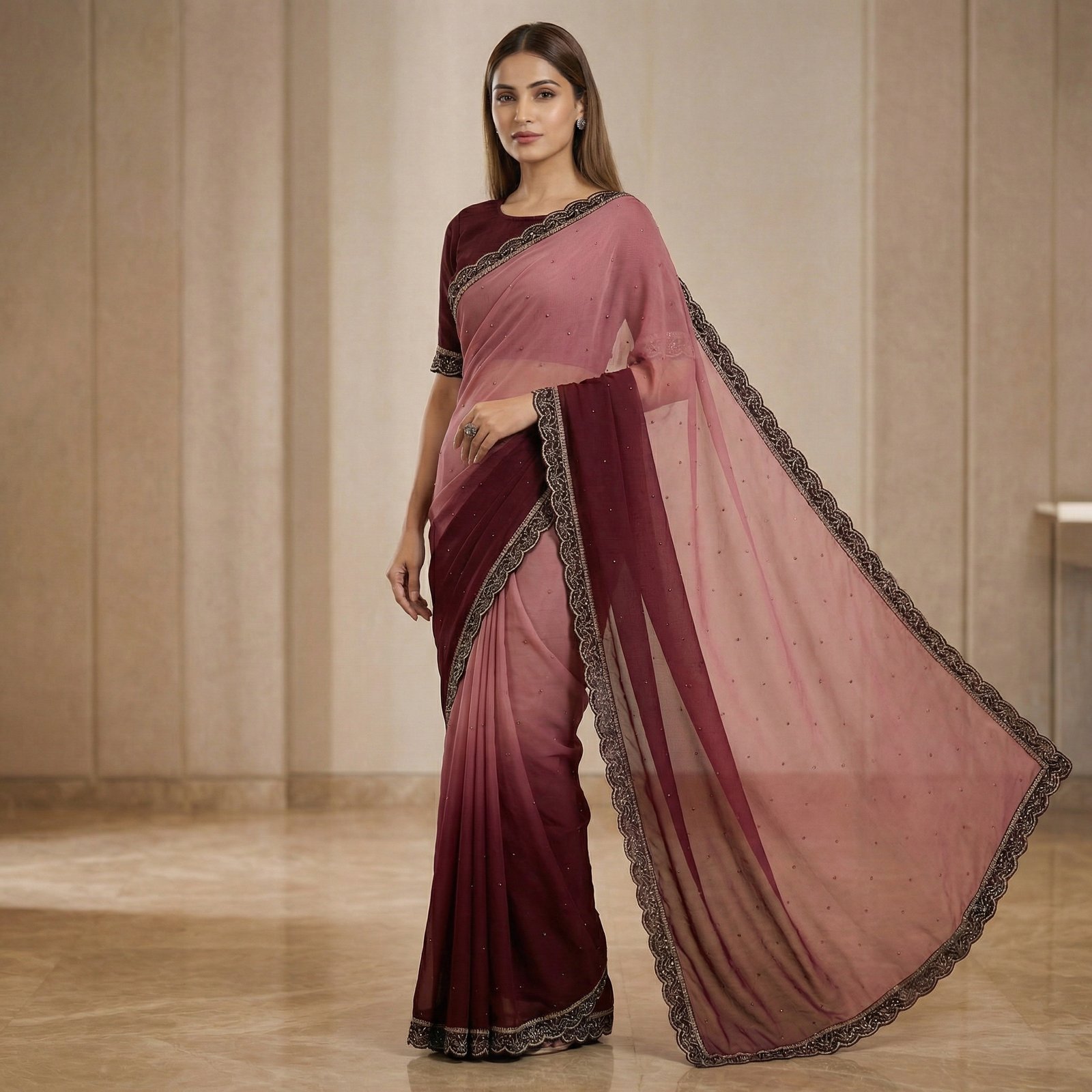 Graceful ombre Georgette saree in wine and dusty rose, adorned with delicate bead work and intricate lace border. Lightweight drape, perfect for festive, party, and evening occasions.