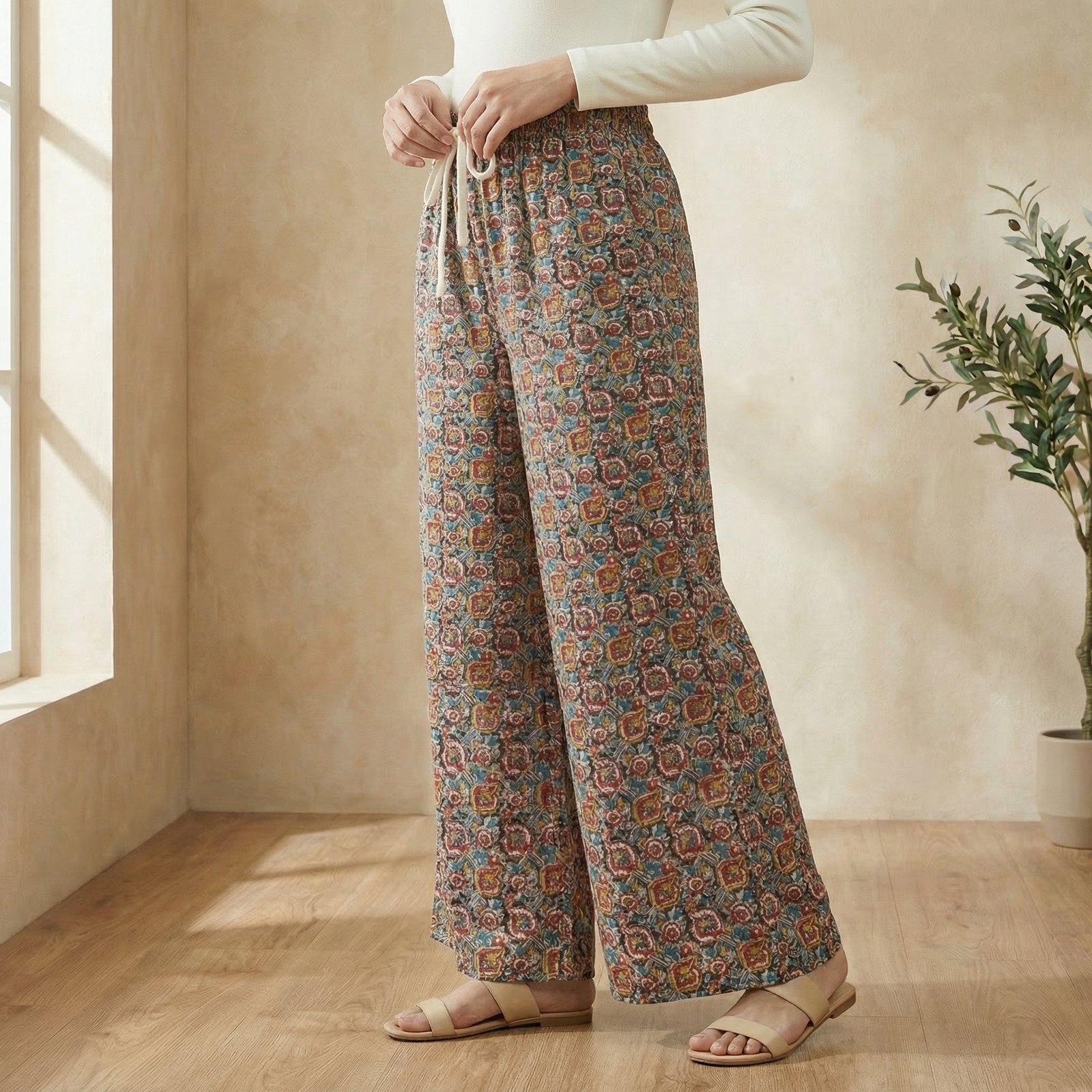 Soft multicolor printed palazzos with a comfortable elastic waistband and adjustable drawstring. Wide flared silhouette with pockets for effortless everyday elegance.