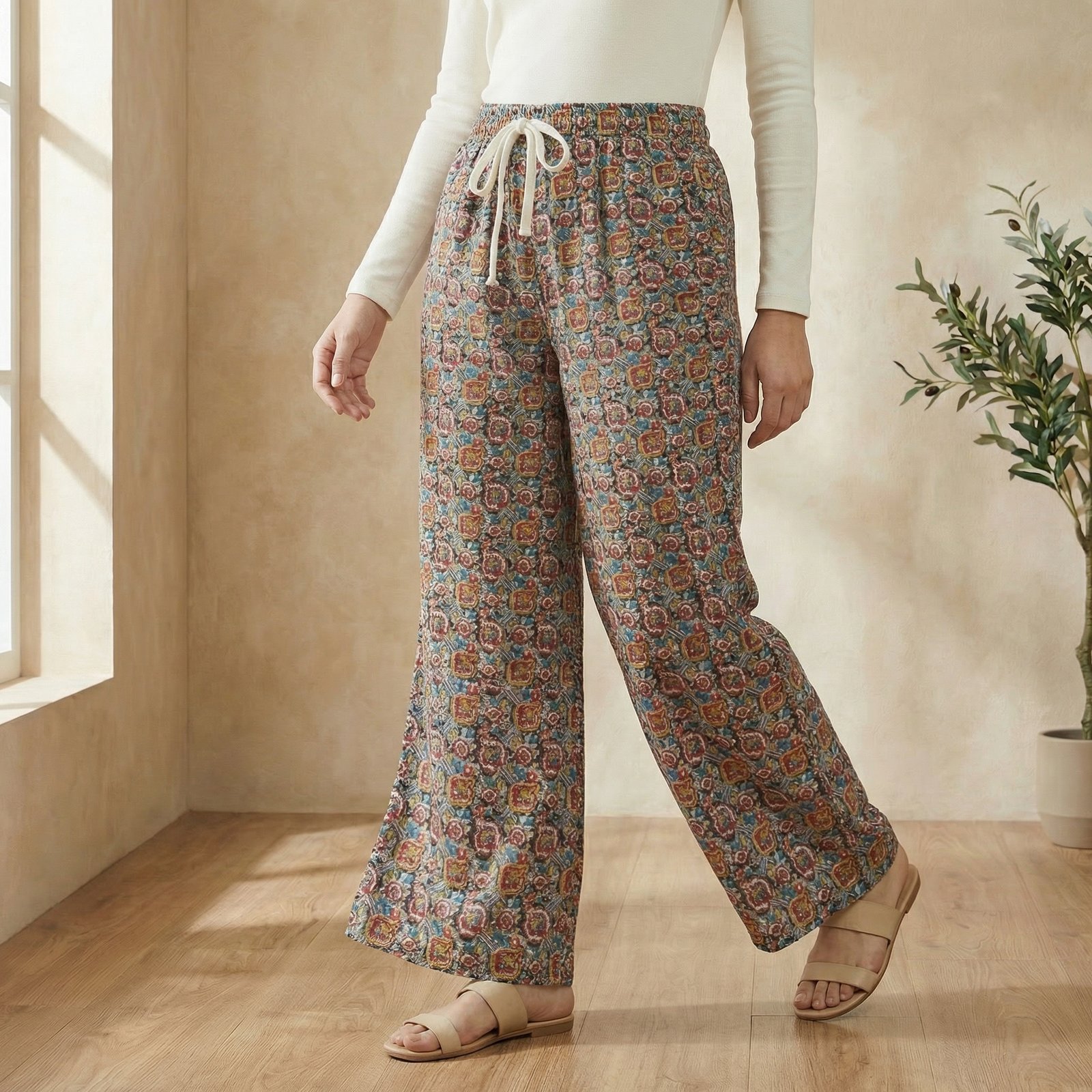Women’s Multicolor Printed Flared Palazzo Pants with Elastic Waist & Drawstring