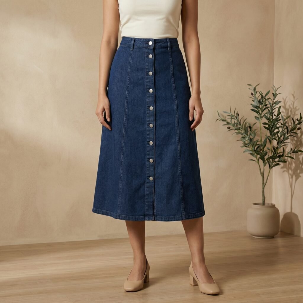Dark Indigo Button-Front A-Line Denim Midi Skirt