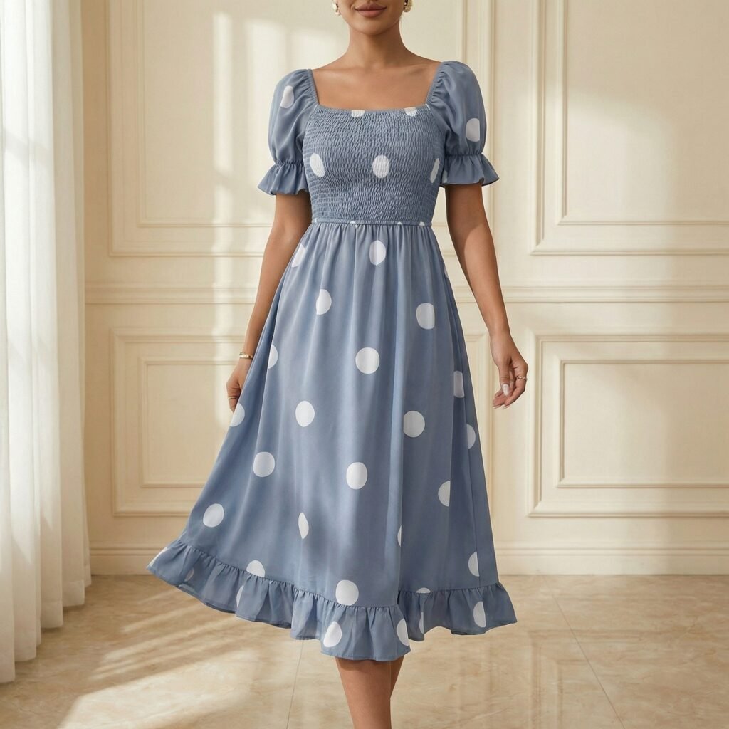 Dusty Blue Polka Dot Smocked Midi Dress with Puff Sleeves