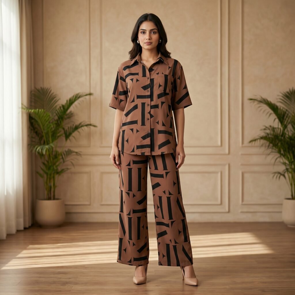 Brown Geometric Print Co-Ord Set for Women – Casual Shirt & Wide Leg Pant Set