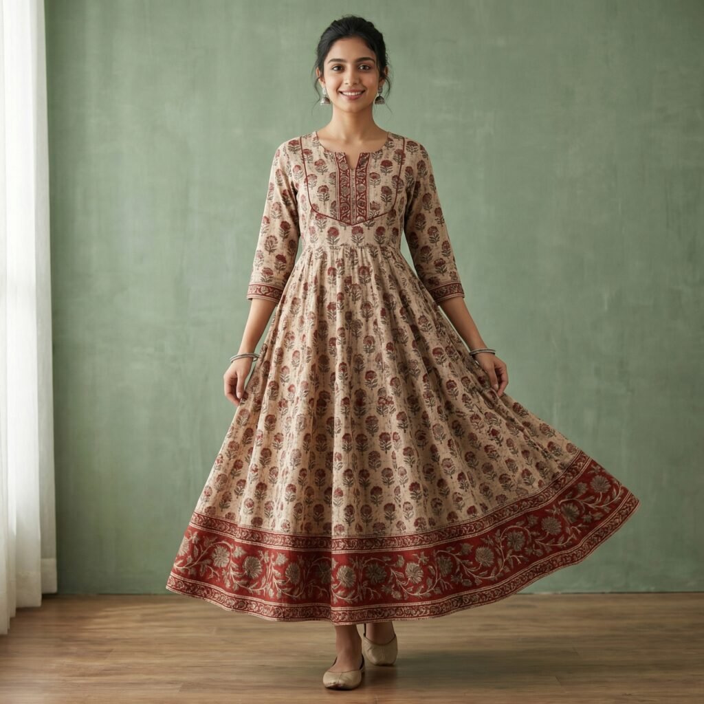 Brown Floral Cotton Anarkali Kurti with Heavy Flare & Printed Hem Border