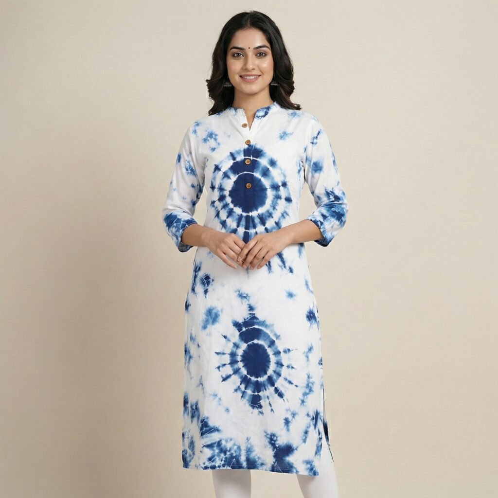 Blue & White Tie-Dye Rayon Kurti – Straight Fit Ethnic Wear