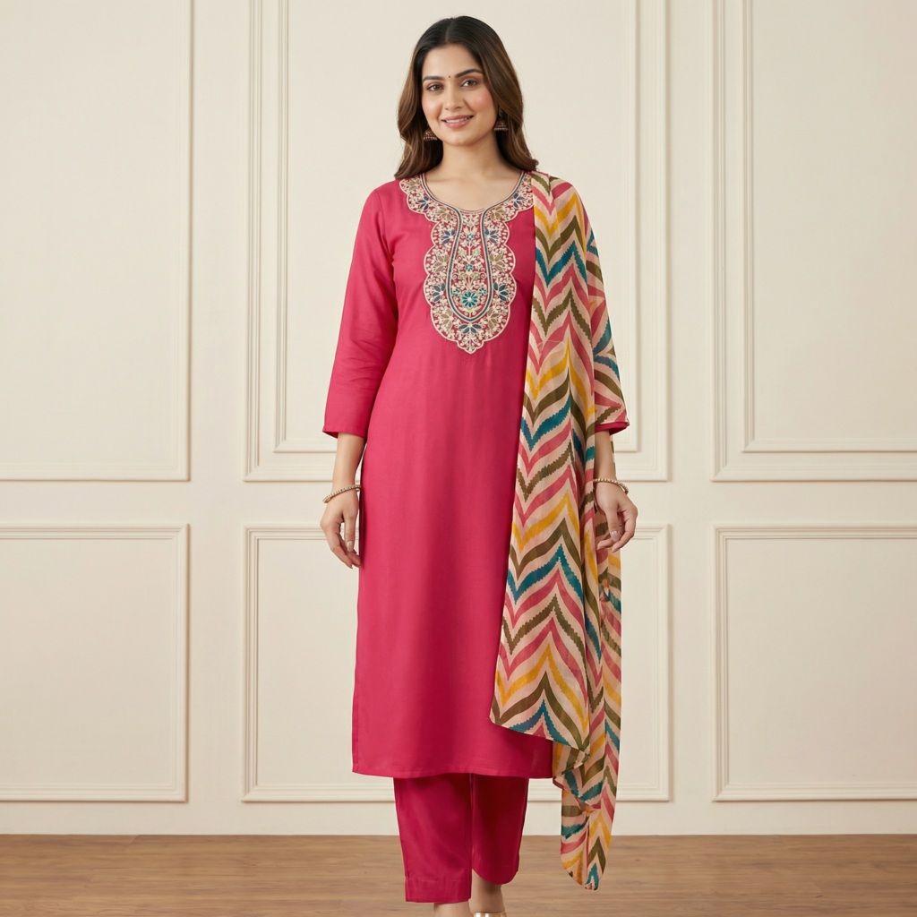 Deep Pink Embroidered Rayon Kurta Set with Multicolor Chevron Dupatta