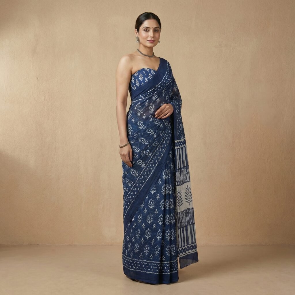 Blue Hand Block Printed Pure Cotton Saree with Contrast Pallu